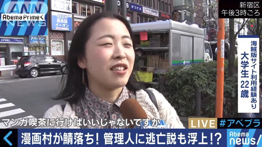 AbemaTV「AbemaPrime」(4月11日)放送で、漫画村利用者の大学生へのインタビューが報じられた。