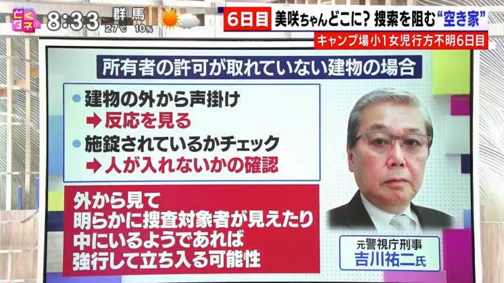⇒小倉美咲ちゃんも人が住んでいない建物にいる可能性がある・所有者の許可を得なければ建物の中は捜索できず、いまだに確認できていない場所もある