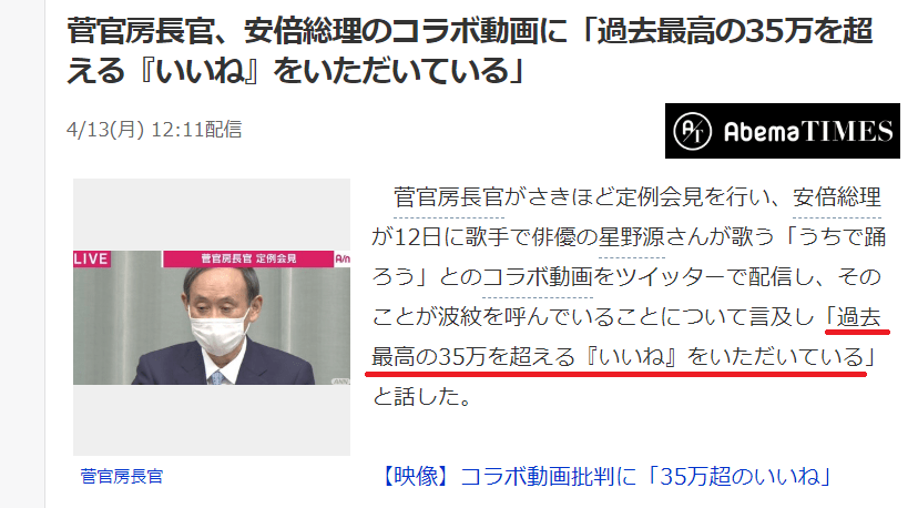 #検察庁法改正法案に抗議します 星野源さんとのコラボが世間の袋叩きに遭い「でも35万もいいねをもらったもんね」と負け惜しみを言った自民党が「500万反対ツイート? 驚かない。1人が100万の声をでっち上げられる世界だから」って苦しいなあ。じゃあ35万いいねもでっち上げかよ。安いでっち上げだぜ。