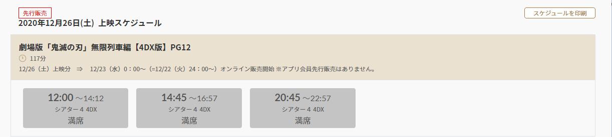 鬼滅の刃MX4D/4DX上映の先行予約は12月23日午前0時より順次スタートしたが、数分で完売したとの情報も。映画館によっては3日先の29日まで受け付けているが、完売が相次いでいる。