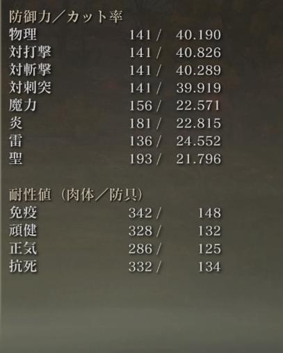 持久力:50(スタミナ実数値155。装備重量105.2【うち60.1を使用】)