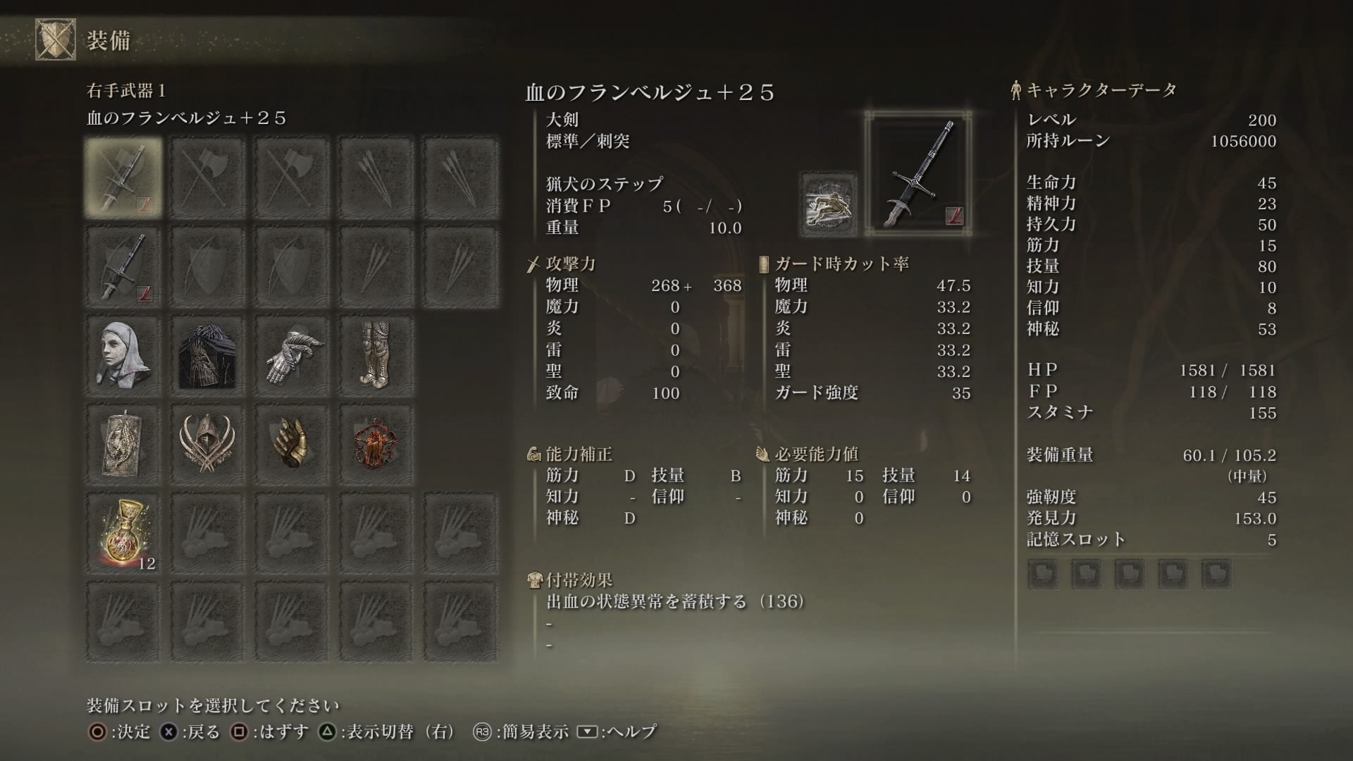 ・血のフランベルジュ+25(出血派生で出血の蓄積値55→101。神秘振りで136に)