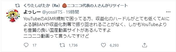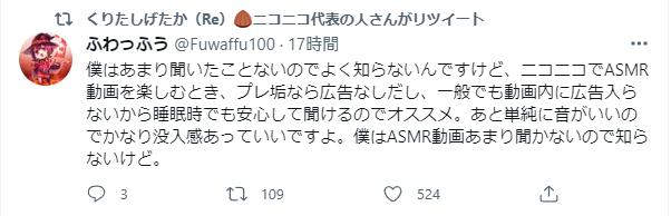 ドワンゴの栗田COOが、ニコニコでのASMR動画を進めるツイートをRTしていた。ニコニコでは、未成年でもASMR動画はOKのようだ。