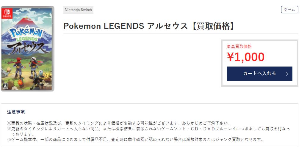 レジェンズアルセウスも買取1000円に到達。こちらもクリア後のやり込み要素が少ないことが挙げられている。