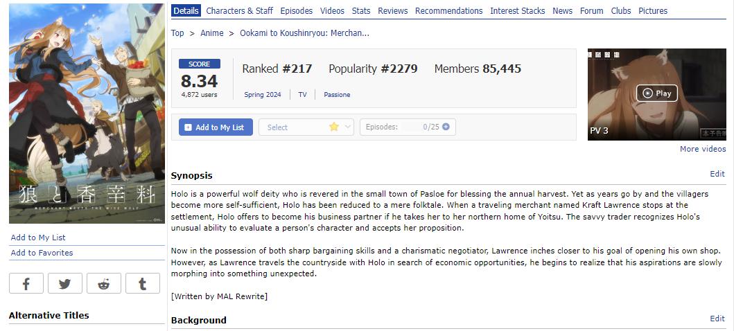 2000年代にアニメ2期まで放送された狼と香辛料の新作リメイクが4月1日に放送された。