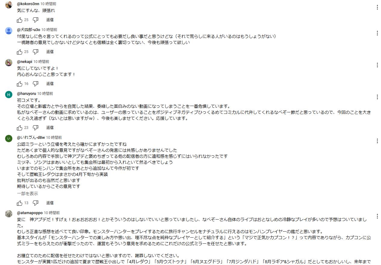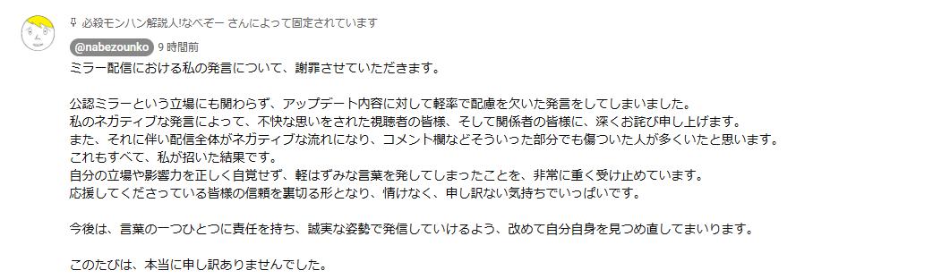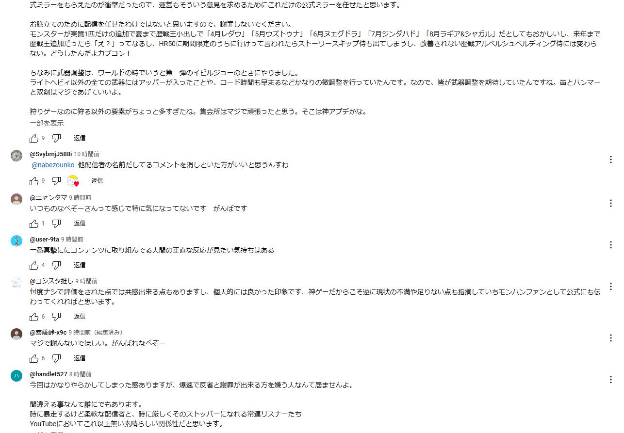ショーケースは、多くの公認実況者がミラー配信していたが、そのうちの1人であるなべぞーがワイルズのアプデ内容に苦言を呈したところ、モンハン信者がブチギレ激怒。なべぞーが謝罪に追い込まれた。