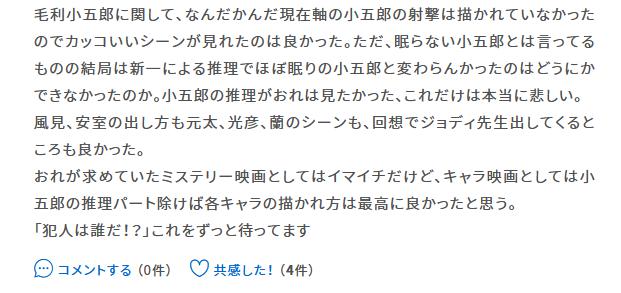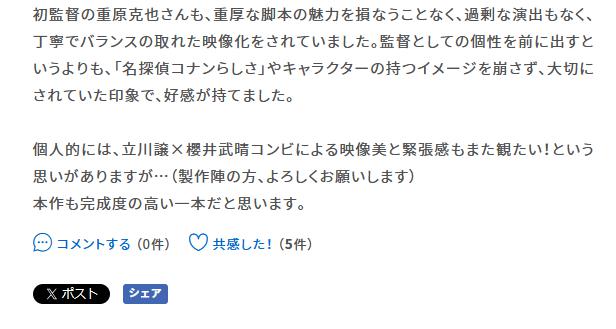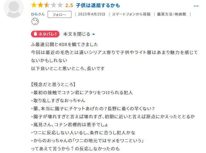 今作は毎年のように言われている「最近のコナン映画は“女さん”に媚びてキャラ推しでゴリ押してるだけ」「派手なアクションばかりで本来のテーマであるミステリーが薄い」といった批判はほぼみられなかった。