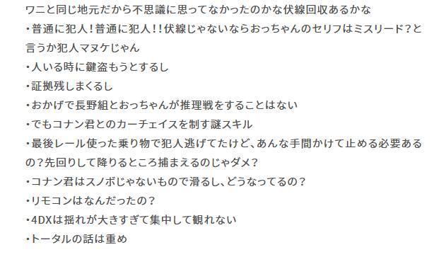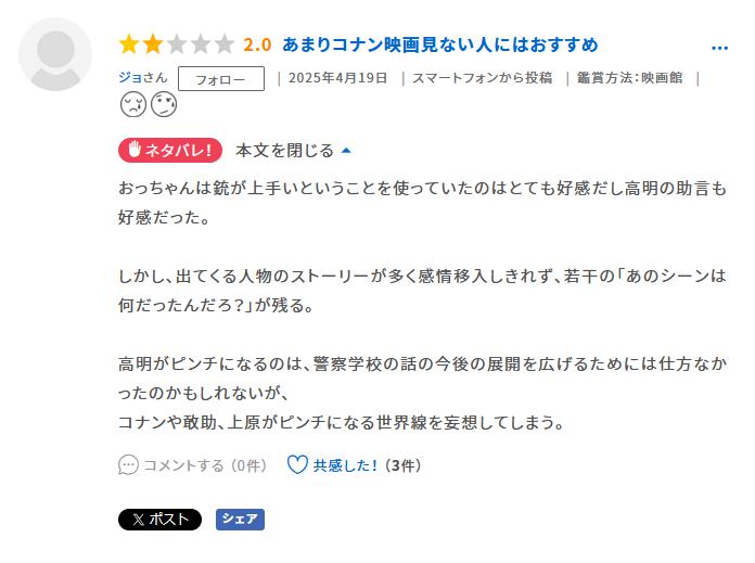 「おっちゃんに自力で推理させてほしかった」「犯人の動機がショボい」「話が難しすぎて子供やライト層置いてけぼり」「キャラ推しやアクションが控えめになったことで地味に映る」といった点は特に多かった。