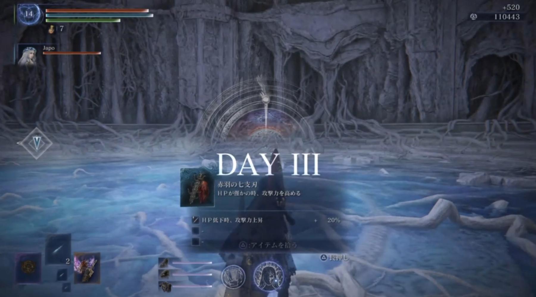 気になる点が1つ。3日目のエリアに入った直後、タリスマン「赤羽の七支刃(HPが僅かの時、攻撃力を高める)」がいきなりドロップした。
