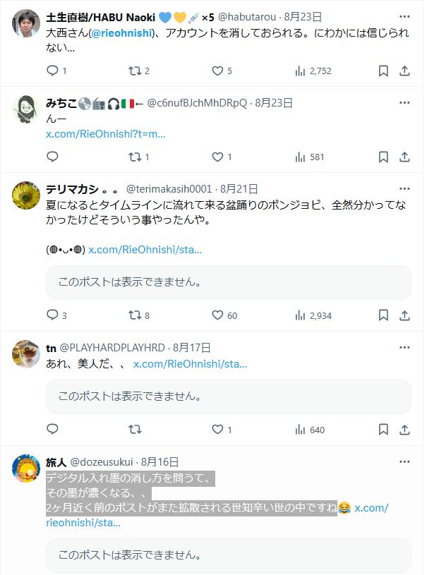 X上でアカウントID(@RieOhnishi)を検索したところ、どうやら14日までは普通に発信していたようだ。