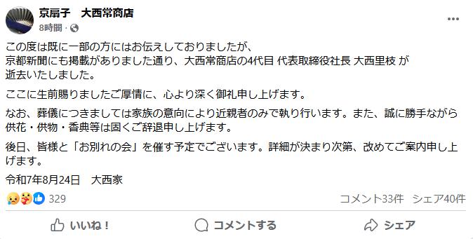 京都市下京区の京扇子店「大西常商店」の4代目社長で、京都の文化や慣習を紹介する「いけず女将」として知られる大西里枝さんが8月22日に亡くなったことが24日、店のFacebookが報告した。