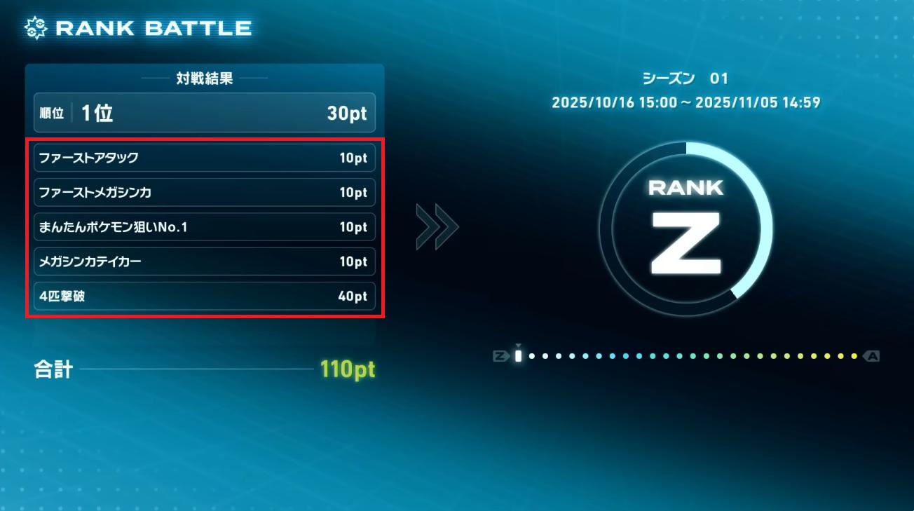 ランクマは競争なのだから、成績が悪ければマイナスになるのは当たり前のこと。メインシリーズのランクマと異なり、ZAのランクマは順位に応じてポイントが増減され、3位が-10pt、4位が-30ptとなるが、行動によるポイントでもポイントが入る。
