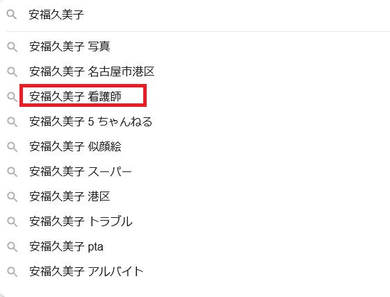 Google検索で「安福久美子」と検索すると「看護師」がサジェスト入りしていた。