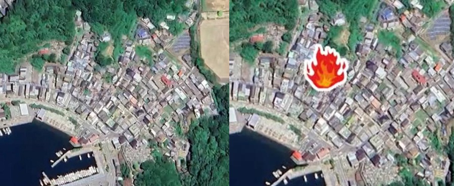 上記画像は、Googleマップの航空写真を参照したもの。火の位置を航空写真で調べたところ、下記画像の赤丸部分のようだ。