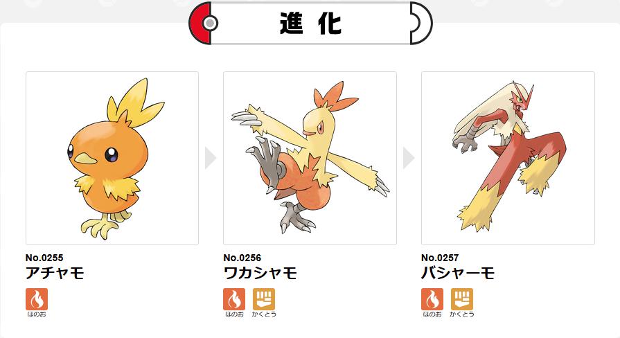 ひよこモチーフと言えば、ホウエン御三家のほのおタイプであるアチャモがいる。アチャモは1進化のワカシャモからかくとうタイプが追加される。