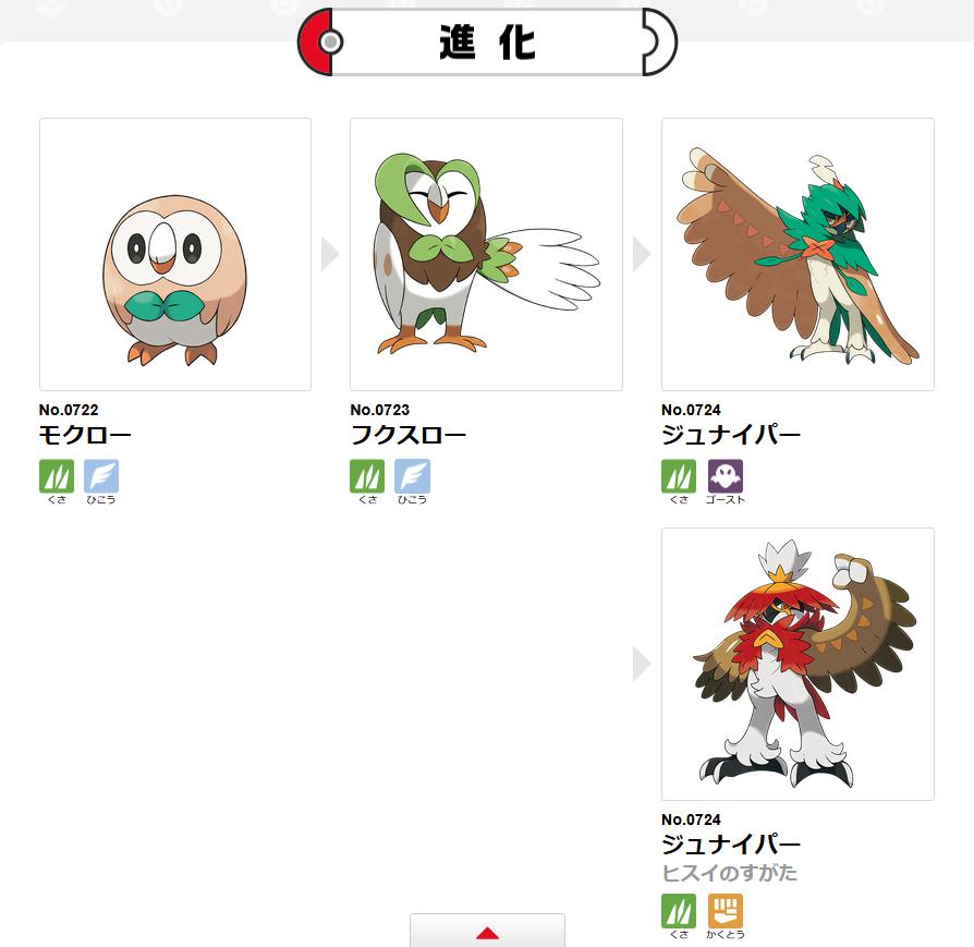 モクローと1進化のフクスローまではひこうタイプが付いているが、ジュナイパーになるとひこうタイプが消える。原種はゴーストタイプ、ヒスイリージョンはかくとうタイプになる。