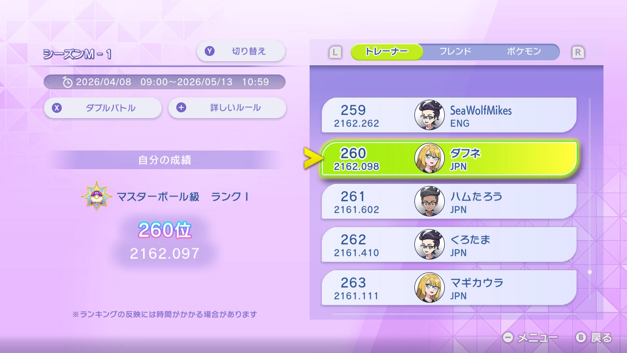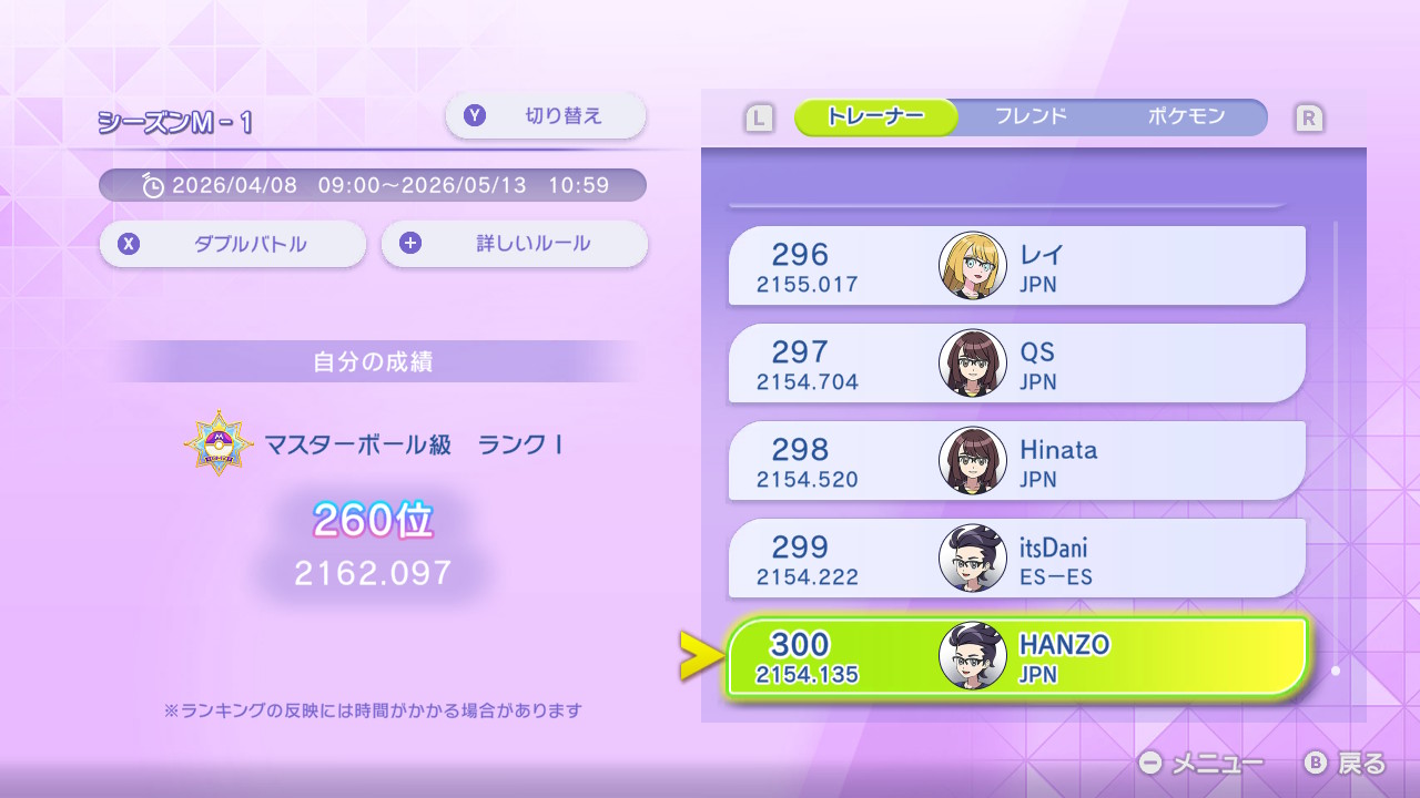 画像では「マスターボール級Ⅰ」となっているが、おそらくチャンピオン級の条件である300位以内に入ってから1回勝たないと、表示上は「チャンピオン級」にならないと思われる。しかし、トレーナーランキングの300位以内には入っているため、チャンピオン級なのは確か。