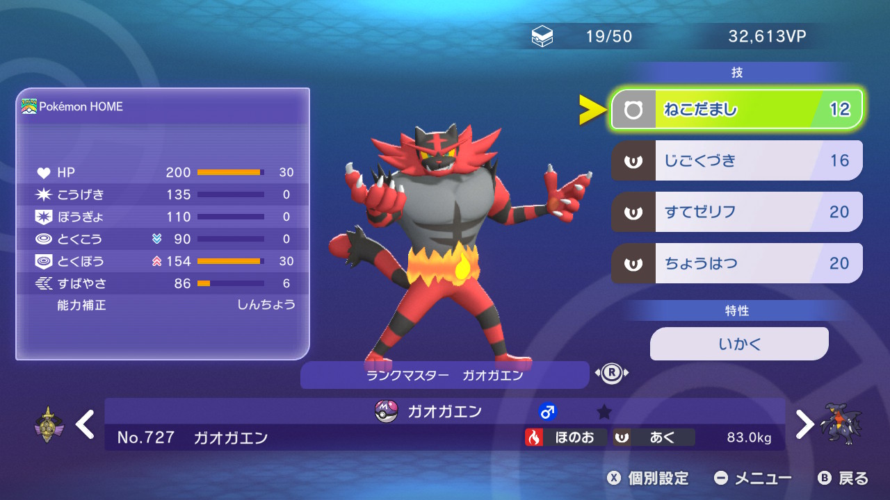 すばやさ:86(6)※ガオガエンミラーで先制じごくづきを使うため。