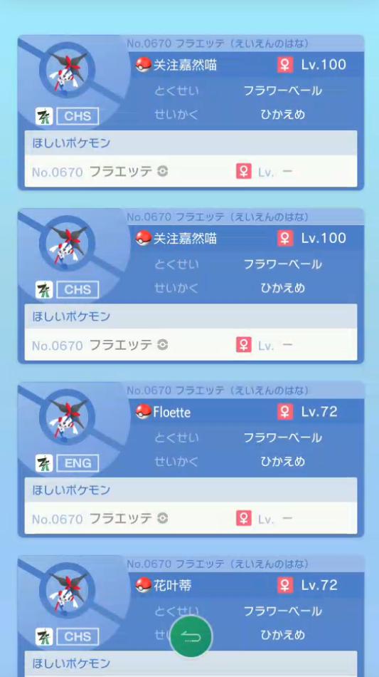 もう1つ、全員ではないが、フラエッテ(えいえんのはな)をレべル100にしているユーザーも。レベル100まで育てたフラエッテ(えいえんのはな)と同じポケモンを求める意味とは。