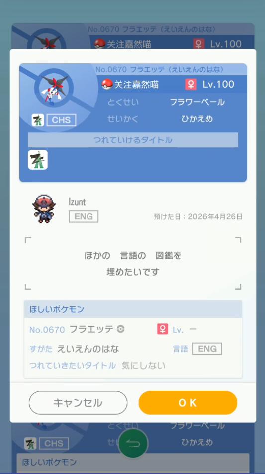 ただ、1つ気になるのは“全員”「ほしいポケモン」にフラエッテ(えいえんのはな)を希望している点。他に「ほしいポケモン」があるからフラエッテ(えいえんのはな)という貴重なポケモンを預けているはずなのに、預けたポケモンと同じポケモンを欲しがるのはなぜか。