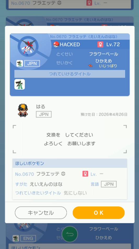 ちなみに、ほかのポケモンでも同じポケモンを求めている場合、改造個体を押し付けて正規品をせしめようとする輩の可能性がある。