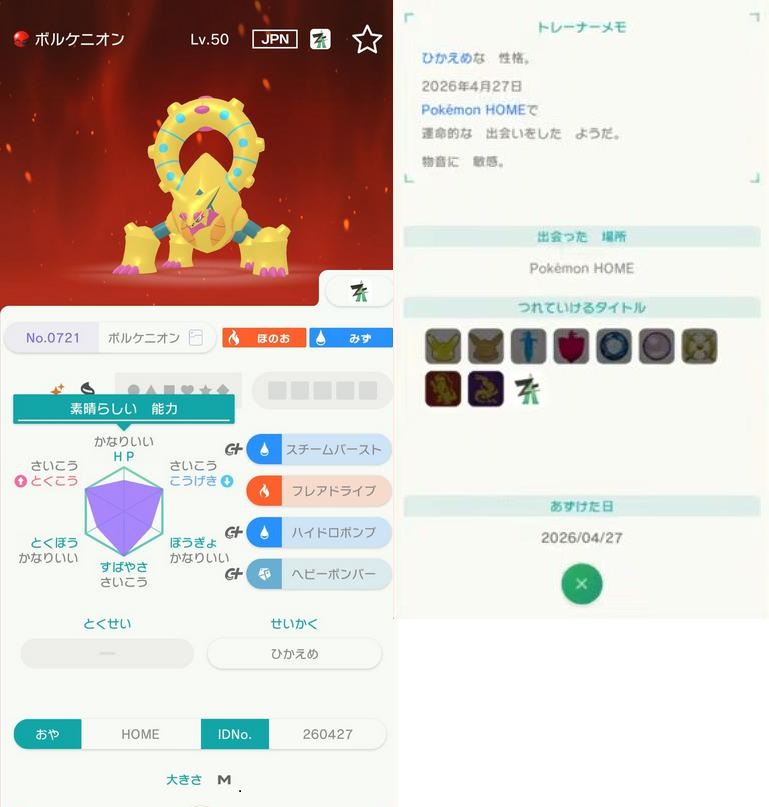 ポケモンHOMEでプレゼントされる色違いボルケニオンの正規個体情報を紹介したい。