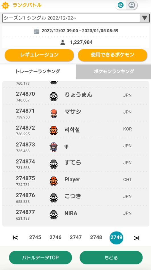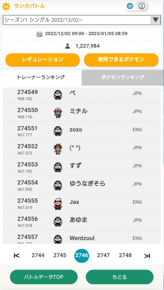SHUSUKEさんのレート帯でのSV・シーズン1の順位は約274,550位付近。