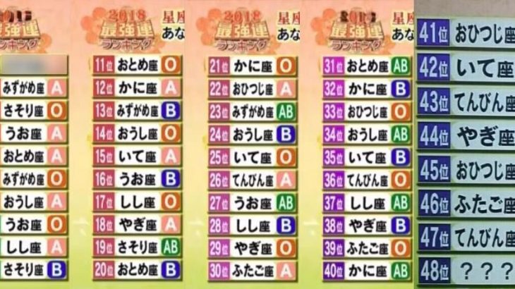 日本テレビ系「ダウンタウンDXDX」(1月11日放送)で、「2018最強運ランキング」が発表。1位は […]